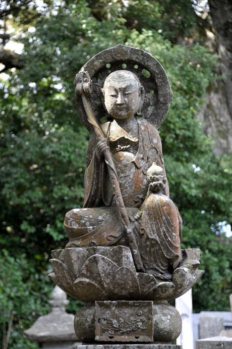 お地蔵さんの姿は、修行僧の形をした立像が一般的。 この半跏像の延命地蔵菩薩は、悟りを開こうと瞑想しつつも、救いを求める人がいたら、すぐに救済に行けるように片膝を立てている。