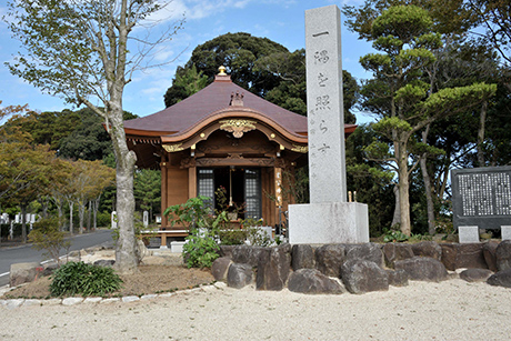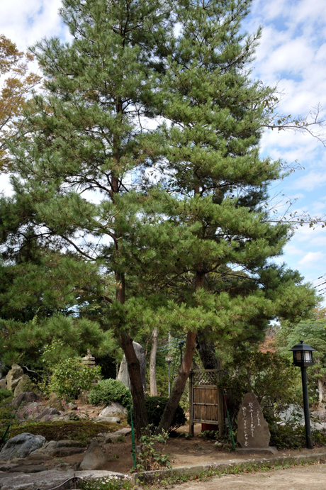 水戸光圀公が訪れたとき、「二本松寺の紅梅を咲けるを」と題して詠んだ歌碑とふたもとの松。 『ふたもとの 松のみとりの 色映えて 紅にほふ 軒のむめが香』